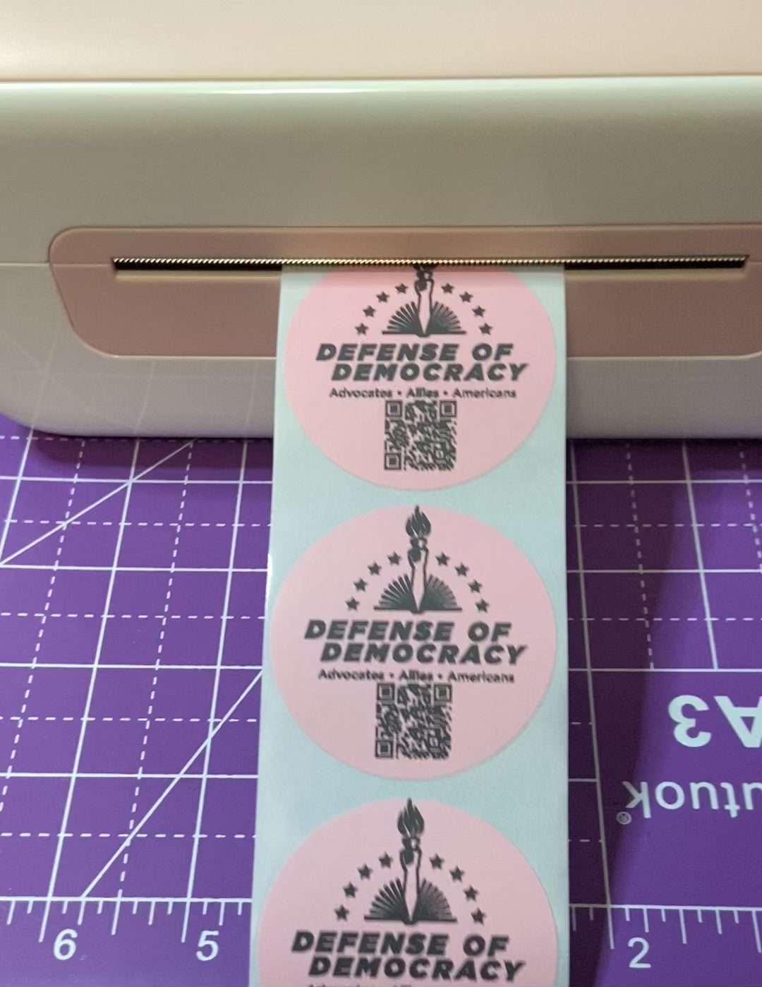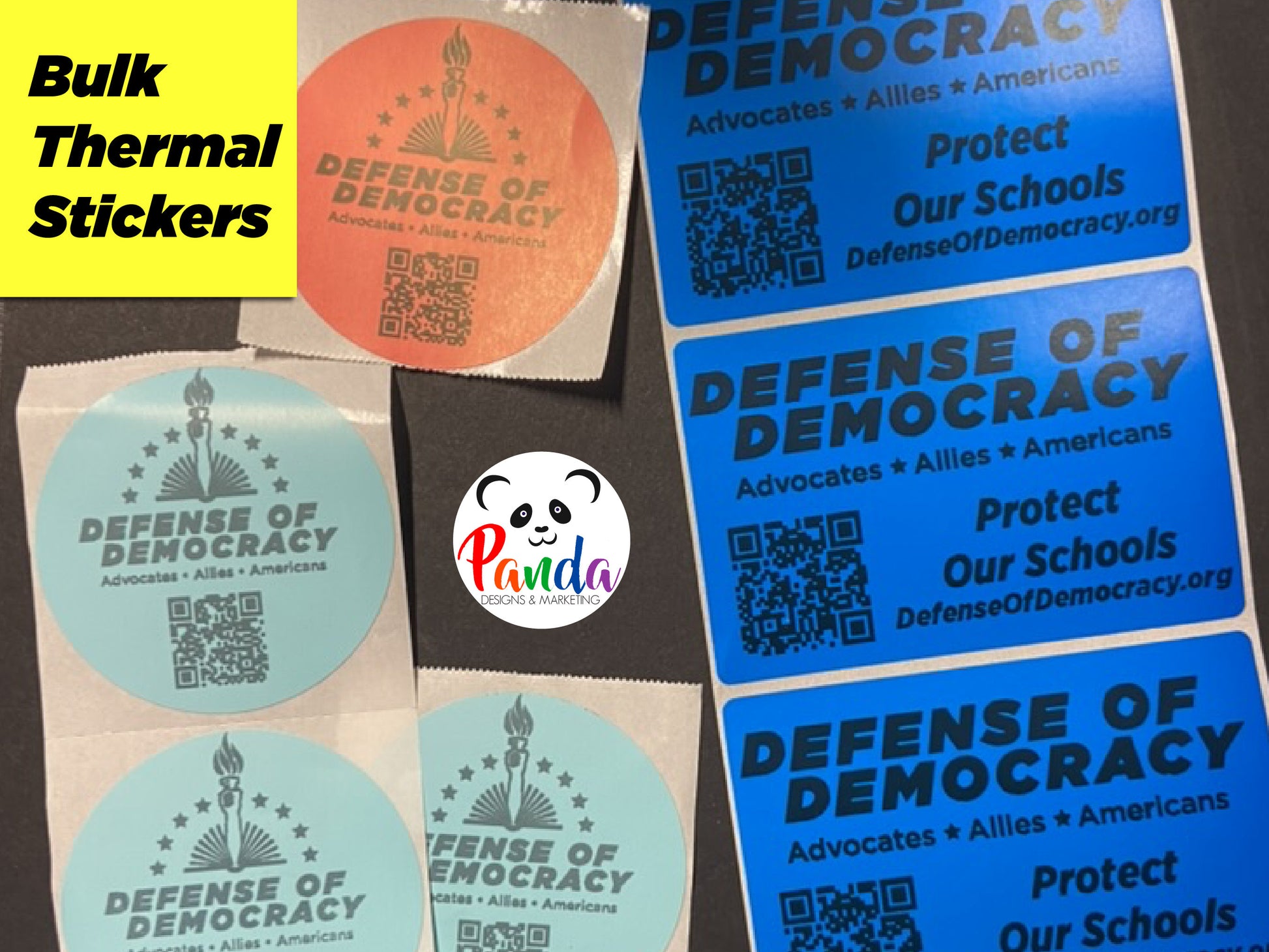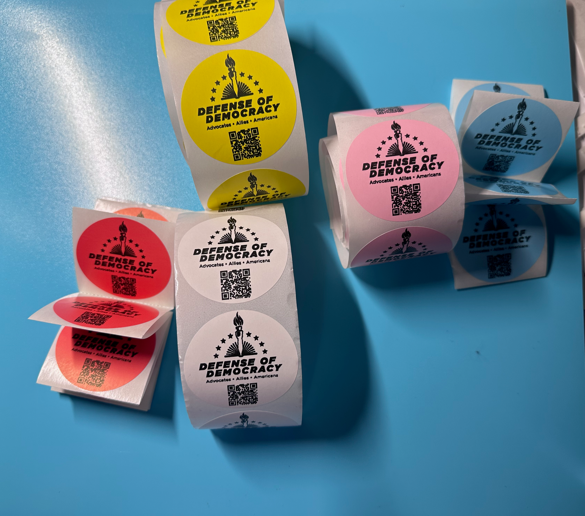 Our thermal paper stickers are an easy and cost-effective way to amplify the mission of Defense of Democracy. Available in packs or rolls of 100+, these stickers are perfect for: