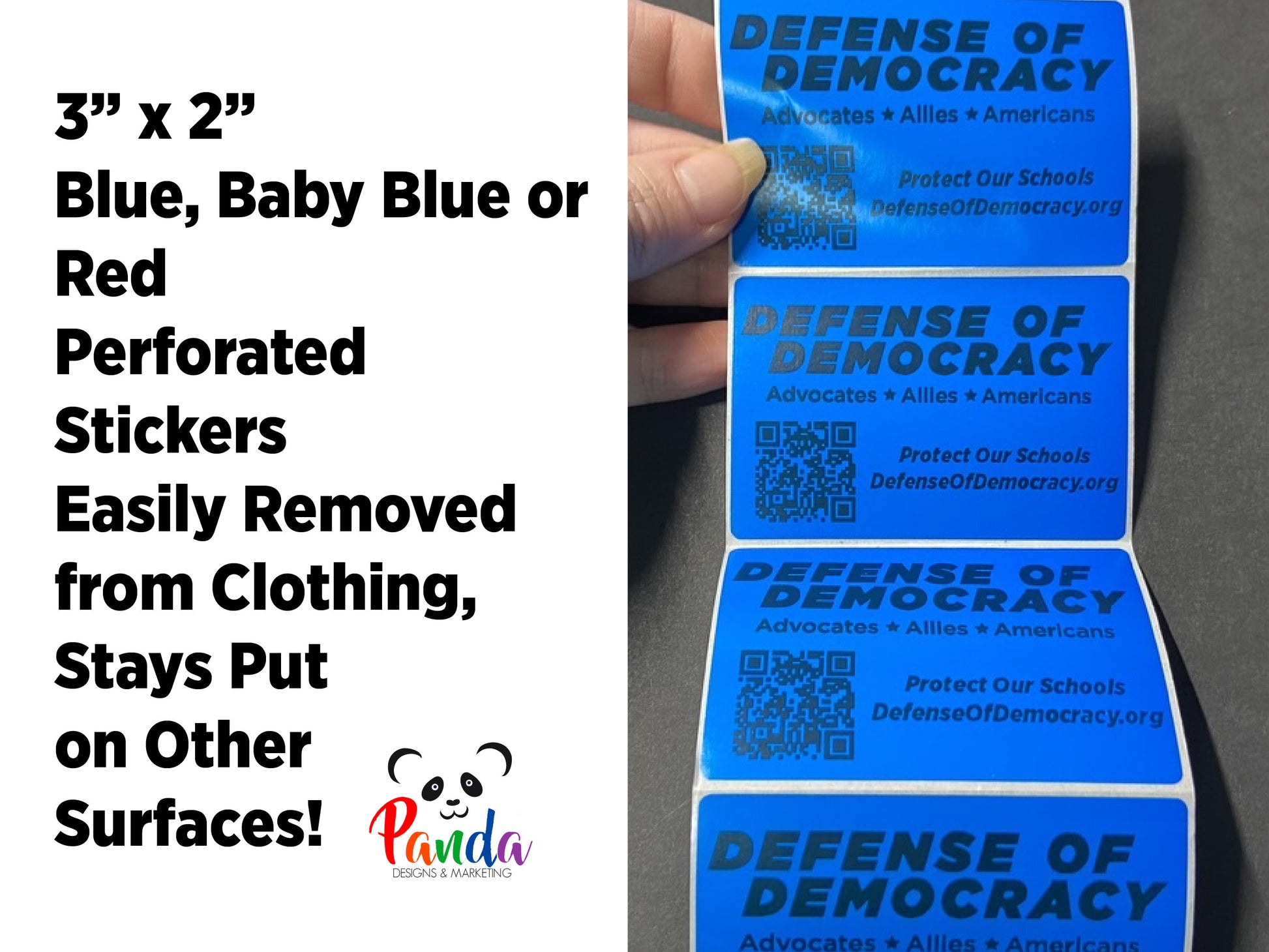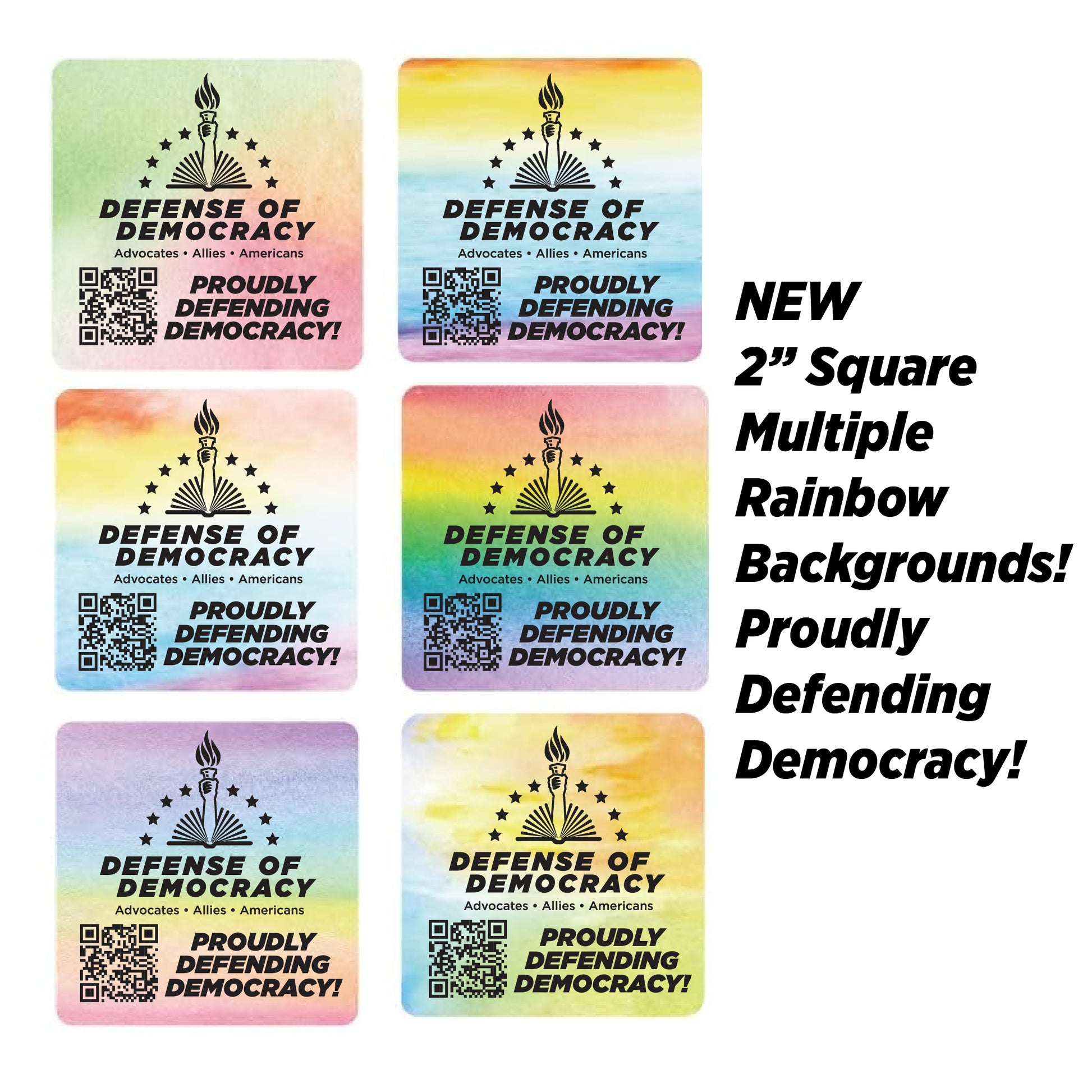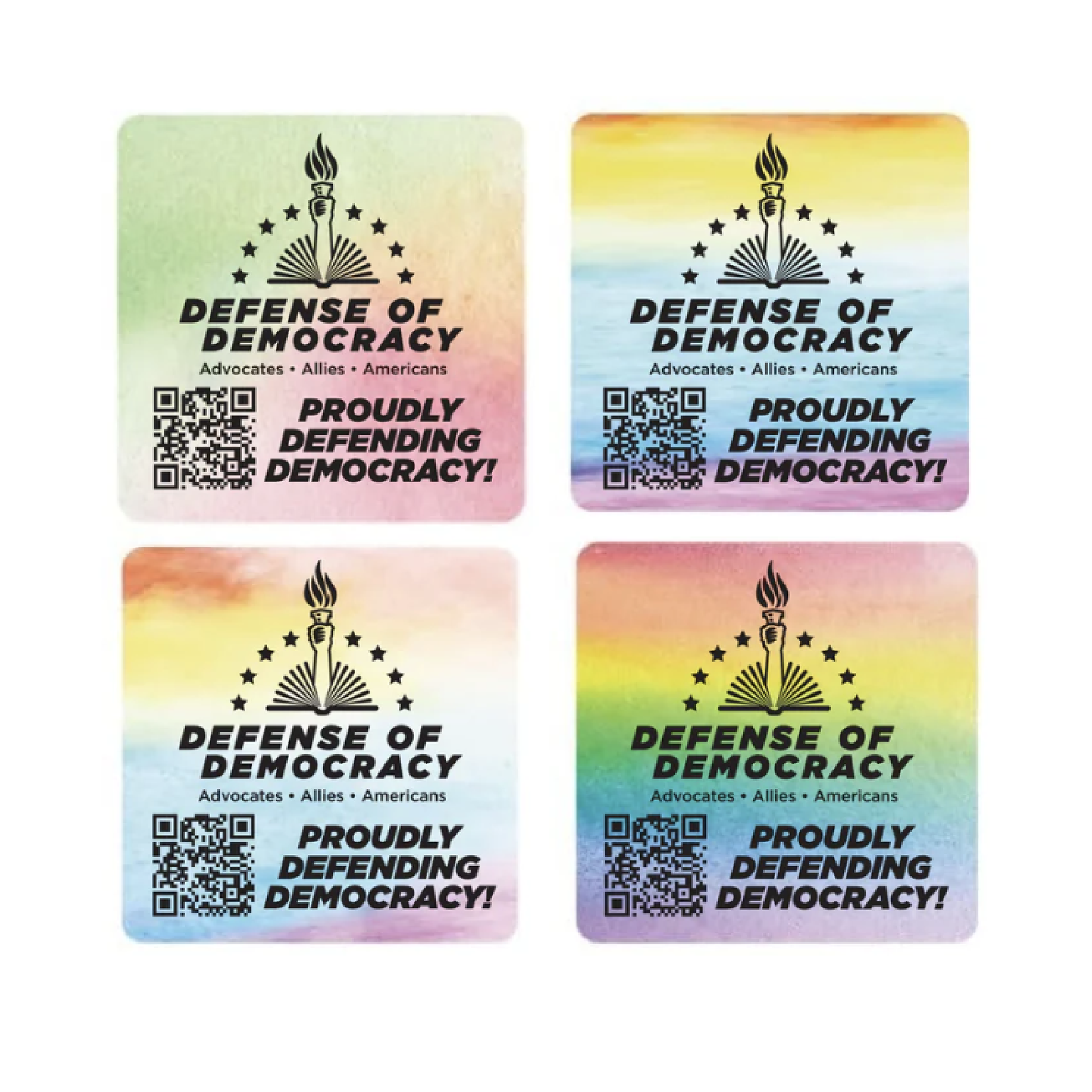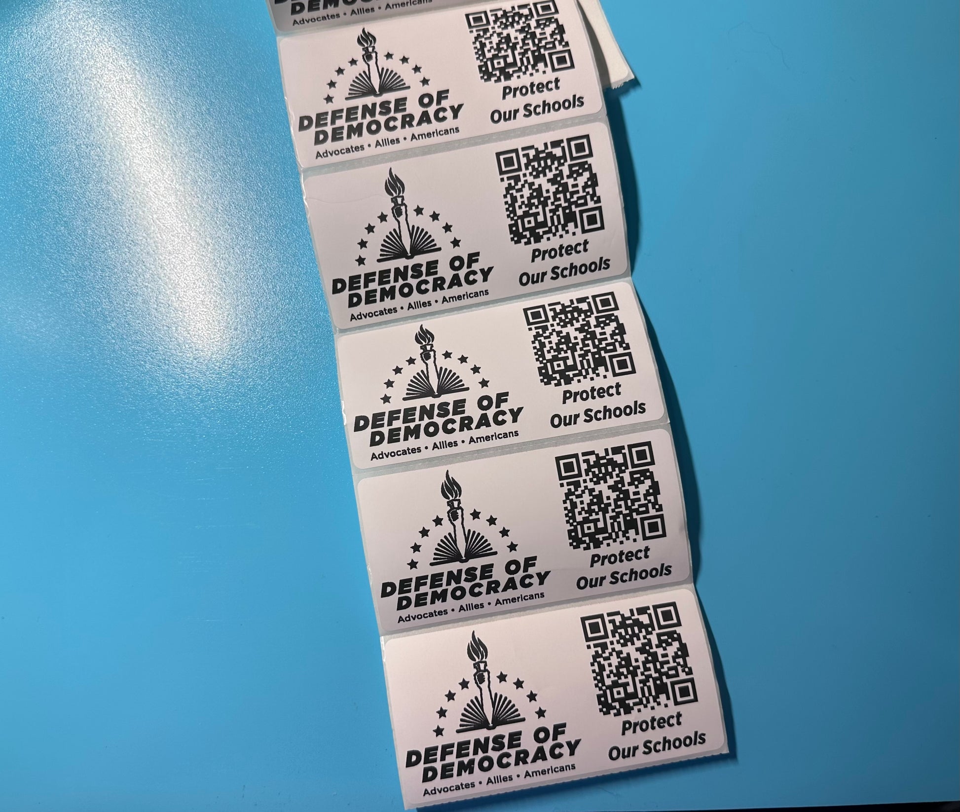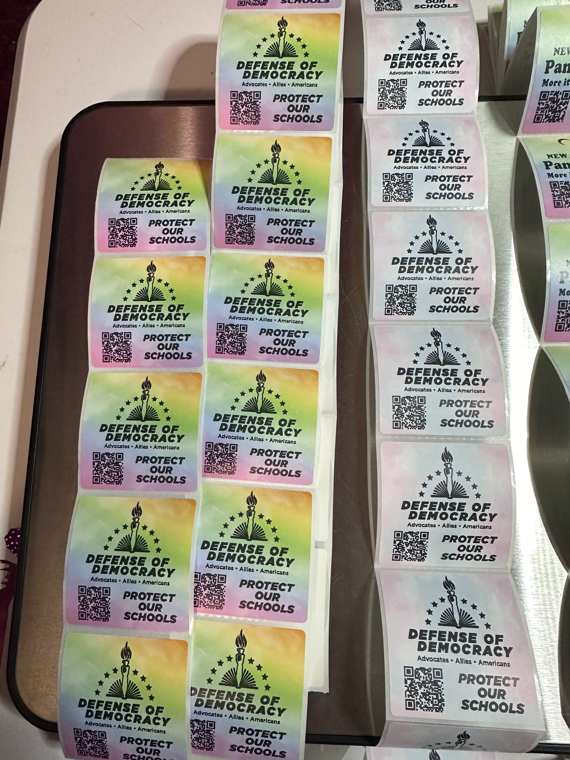 Defense of Democracy, stickers for activism, advocacy stickers, bulk protest stickers, inclusive education, anti-book ban, LGBTQ+ support, school board action, nonprofit outreach, civil rights merch, grassroots organizing tools, teacher support, anti-extremism, QR code stickers, tabling supplies, educational equity