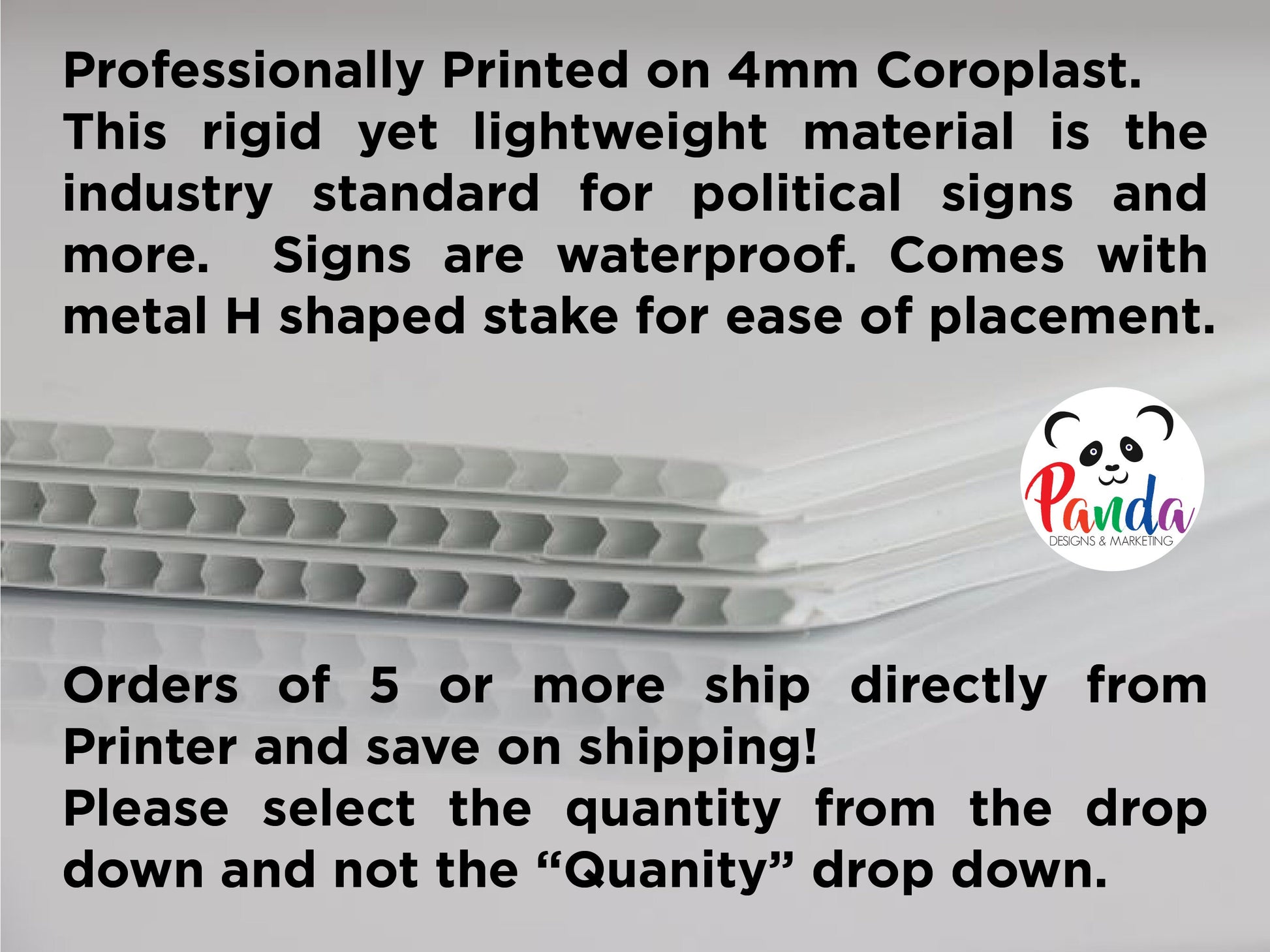 Double Sided 4mm Coroplast Signs. Multiple Designs to choose from! 24" wide by 18" tall. For larger quantities, signs wil have a 1/2" white border.