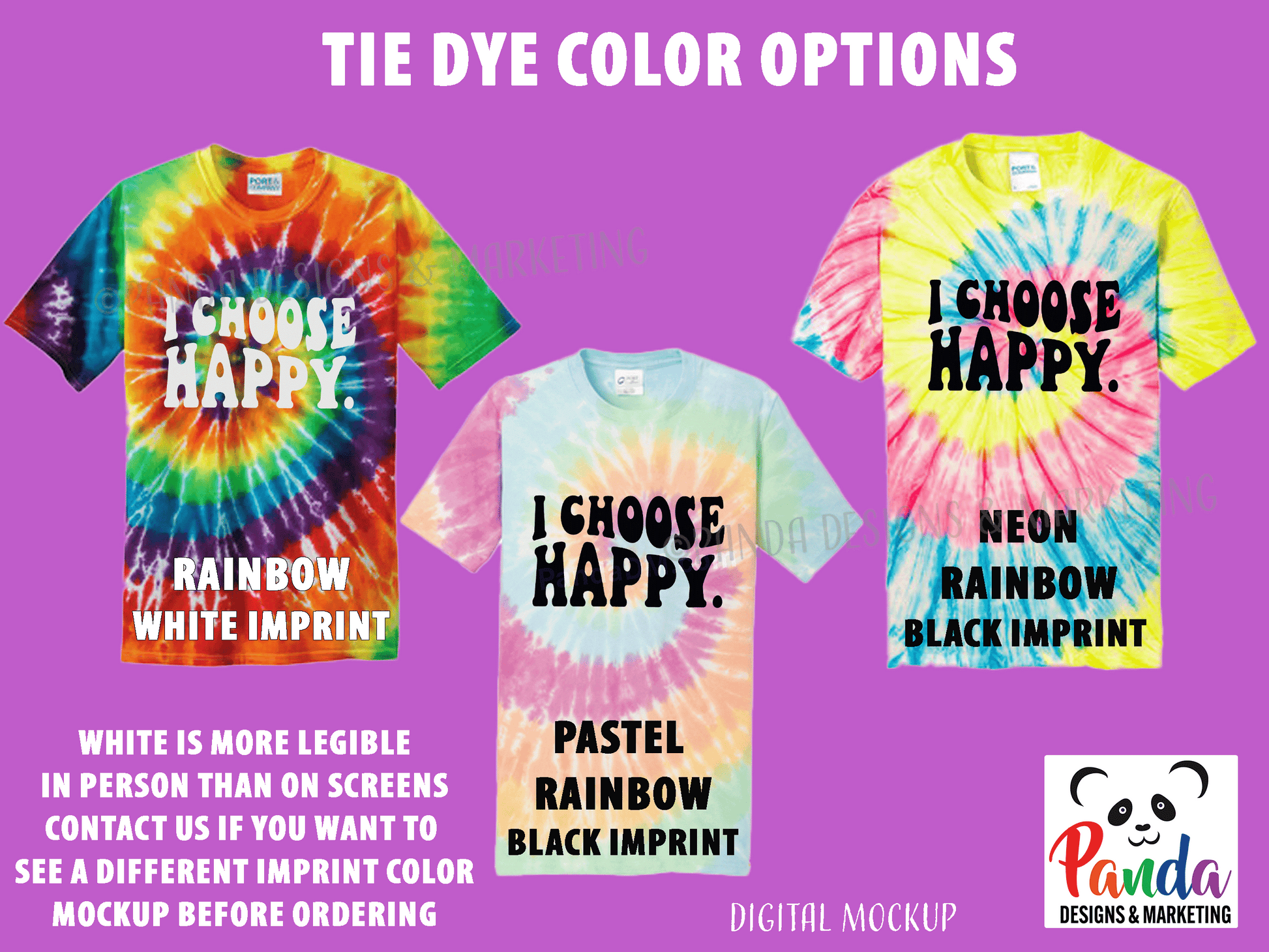 Design & Features: Featuring "I CHOOSE HAPPY." in a whimsical and groovy 70's style font, these tie-dye shirts are available in captivating colors like Rainbow, Pastel Rainbow, and various other tie-dye patterns. The white or black imprint stands out against the vivid backgrounds, ensuring your positivity statement shines.